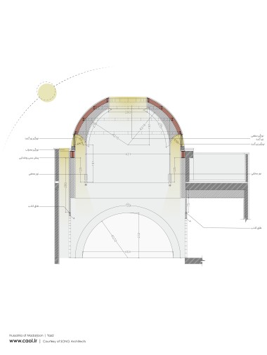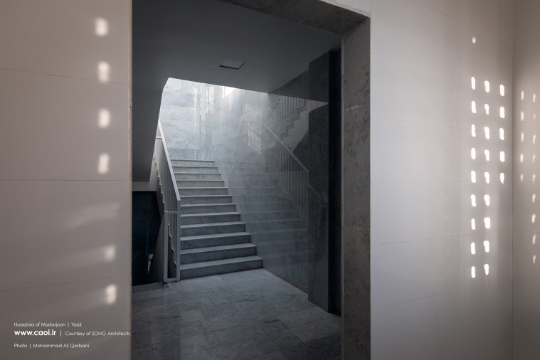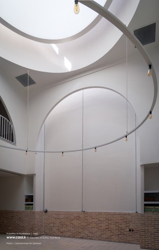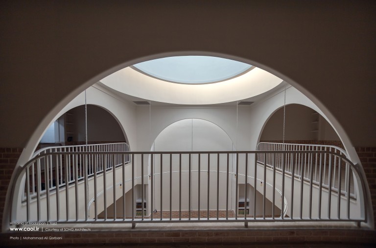 At the heart of the building lies a two-level central courtyard measuring 10 by 12 meters, serving as the core space for cultural and religious activities. The lower level is allocated for men, while the upper level is for women. This arrangement draws inspiration from traditional Hussainias of Yazd, where women observed ceremonies from upper floors. A central void framed by arches visually and spatially connects the two levels. At its peak, the void culminates in a dome with a circular skylight that channels daylight into the hall and reinforces the spiritual sense of ascension.