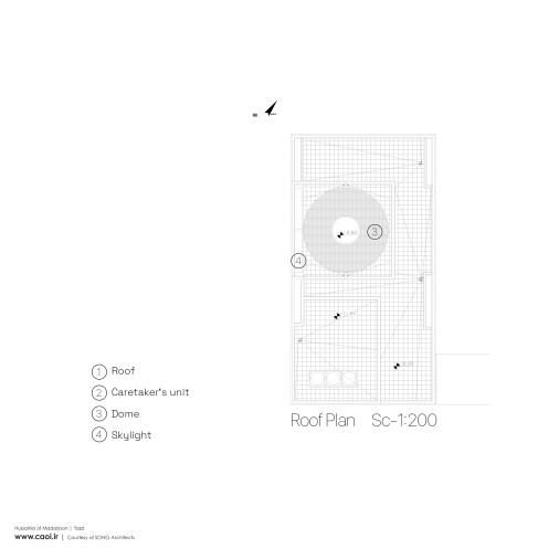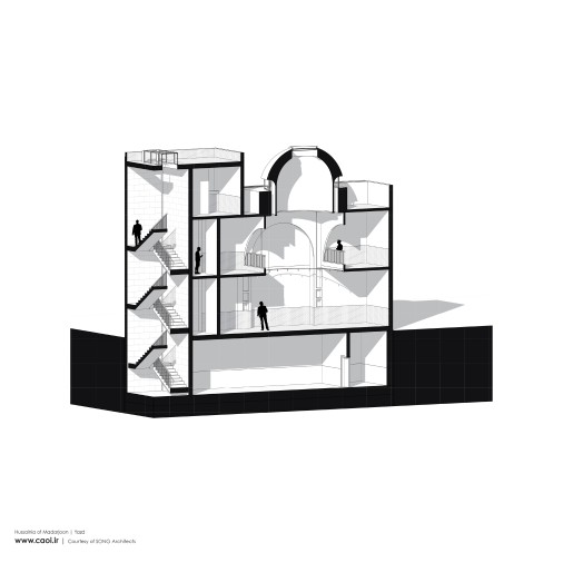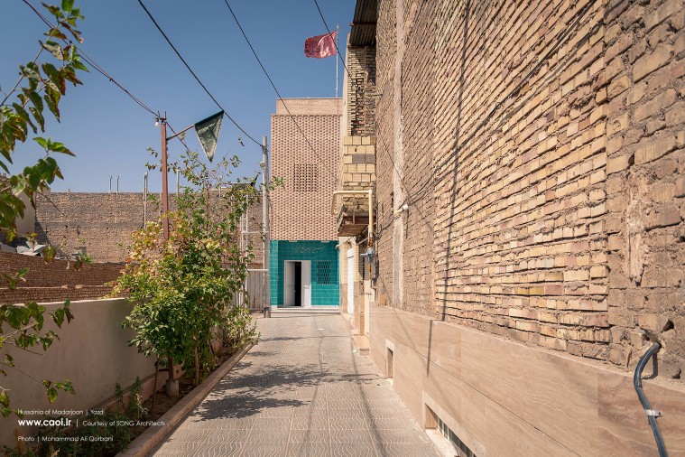 Hussainia of Madarjoon, with a cultural–religious function, is located in the Emam Shahr neighborhood of Yazd. The site measures 10 by 18 meters (a total of 180 m²) and is accessed from a 3-meter-wide passage on the northeast side. The building is organized across four levels: basement, ground floor, first floor, and rooftop.