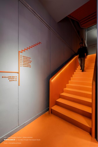- Showroom and Galleries: The ground-floor showroom is the first stage of the spatial narrative. Four interconnected galleries explore movement and perception: two primary spiral galleries guide circulation and immersion, while two smaller, subtly curved rectangular galleries offer perceptual pauses. Neutral gray walls provide a calm backdrop, allowing the orange identity to infiltrate the space and generate energy, playfulness, and engagement. The sequence of spaces mirrors the operational flow of painting processes, translating industrial rhythm into architectural experience.