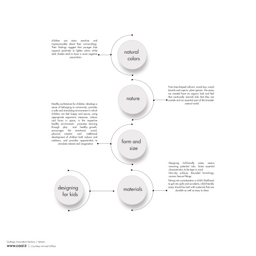 This building had 5 floors and a complex and large-scale form, which was supposed to become the largest co-working center in Iran according to a long-term plan. In the meantime, according to the designer's suggestion, the third and fourth floor could be a good test start for this collection. One of the concerns of new businesses is the conflict between startup life and living with the family. Especially families with children. In the conducted research, we found that most of the elite graduates (especially women) completely leave the competition and start-up activities after getting married and having children. In foreign examples, we found an answer to this problem, which was the creation of a child-friendly work environment. By developing this concept, we reached a family-friendly work environment and prepared a comprehensive physical plan in this direction. According to the above concepts, the intended design site was divided into two public and family-friendly parts interacting with each other. In the public part, we achieved a combination of private and shared spaces by using all that was mentioned in the research, and in the family-friendly part, we tried to give an acceptable answer to the conflict of the child's presence next to the work area.
