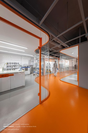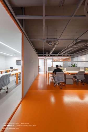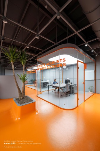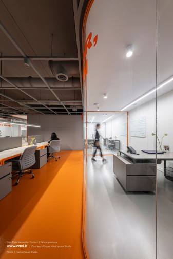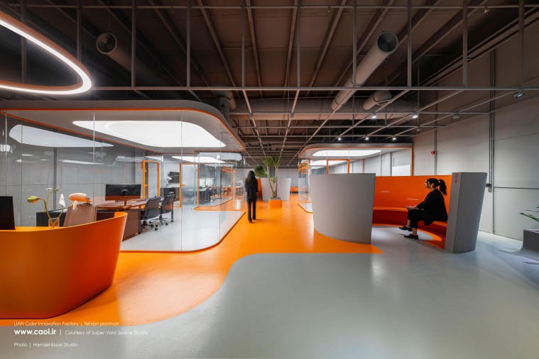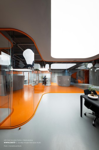 طبقهی اداری اما سطح دیگری از بازی گفتمانی را فعال میسازد: مواجههی نظم اداری با بازیگوشی رنگ. اینجا پارتیشن های شیشهای مستطیلگون با لبه های خم در کنار احجام دوار نارنجی، همزمان منطق دیسیپلین و انرژی را به هم میدوزند. نتیجه فضایی است که بهجای تقابل، از طریق تعامل میان ساختارمندی و بازیگوشی، نوعی دیالکتیک فضایی را میسازد.